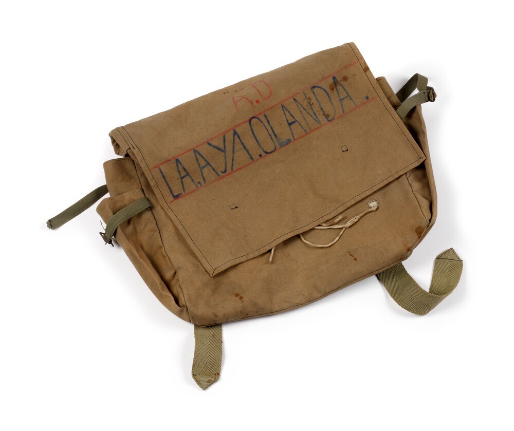 Een rugzak van kaki stof met in rood de initialen "A.D." (Albert Ditz) en in blauw: "La, Aya. Olanda.