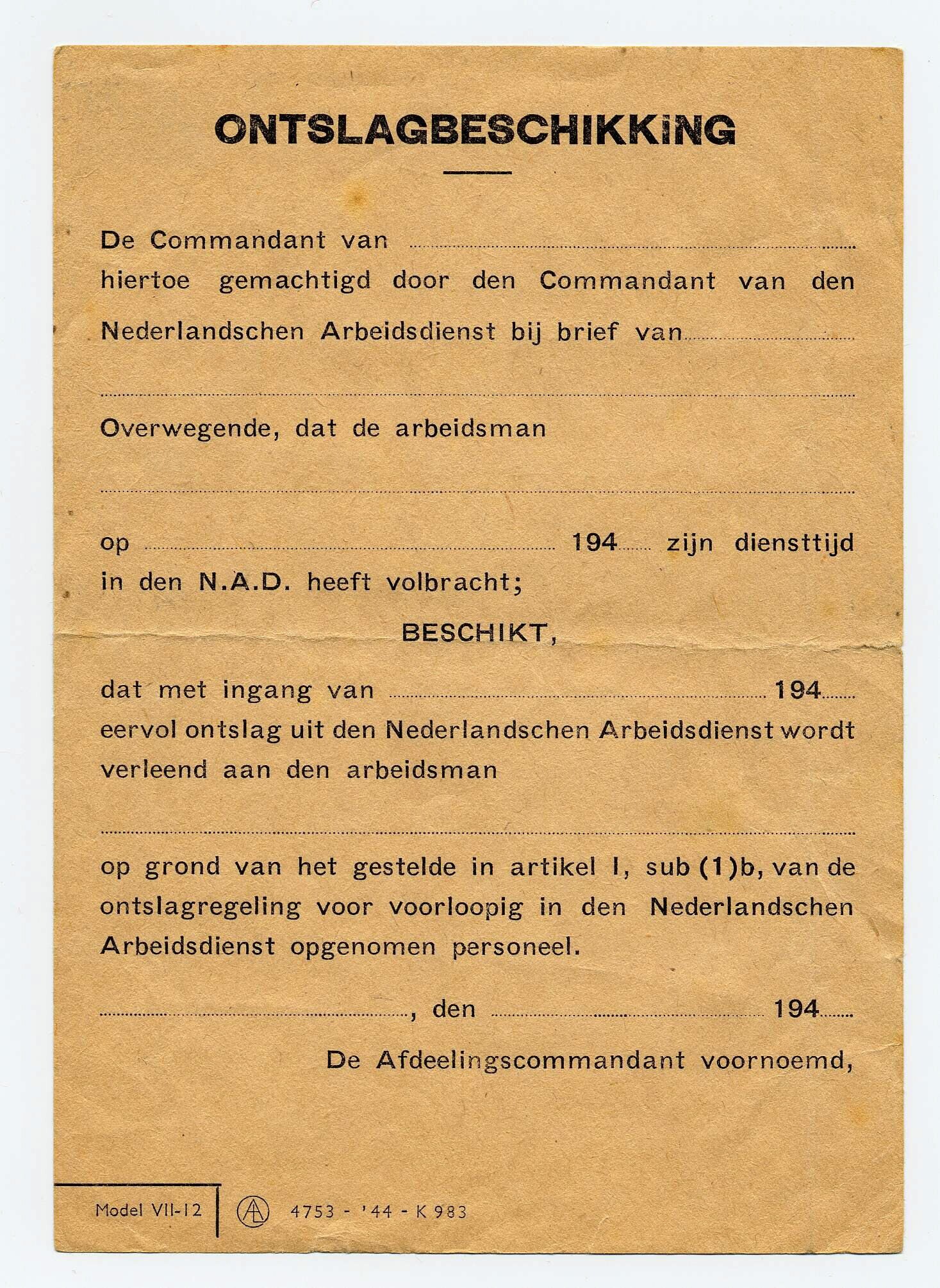 Blanco formulier waarmee een "arbeidsman" waarmee een "arbeidsman" uit de Nederlandsche Arbeidsdienst wordt ontslagen.