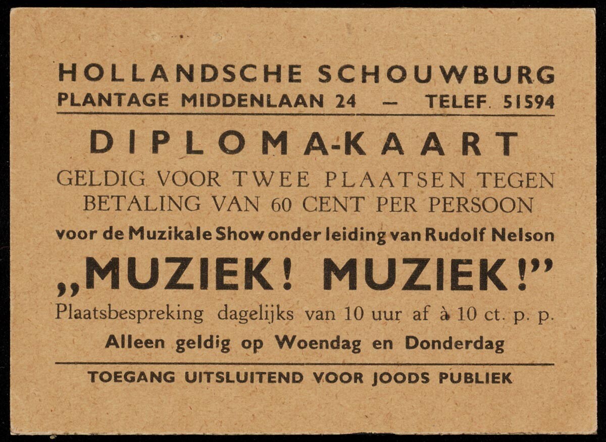 Toegangsbiljet voor de Hollandsche Schouwburg. Onder de adresinformatie de tekst: "Diplomakaart, geldig voor twee plaatsen tegen betaling van 60 cent per persoon voor de muzikale show onder leiding van Rudolf Nelson 'Muziek! Muziek!'. Plaatsbespreking dagelijks van 10 uur af … 10 ct. p.p. Alleen geldig op Woensdag en Donderdag. Toegang uitsluitend voor Joods publiek."