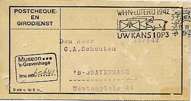 Begeleidend schrijven bij een formulier waarmee de Postcheque- en Girodienst inlichtingen inwon over het al of niet jood zijn van de houders van postrekeningen. Het document is gericht aan de heer C.A. Schouten te Den Haag en bevat een poststempel van de Winterhulp-loterij 1942.