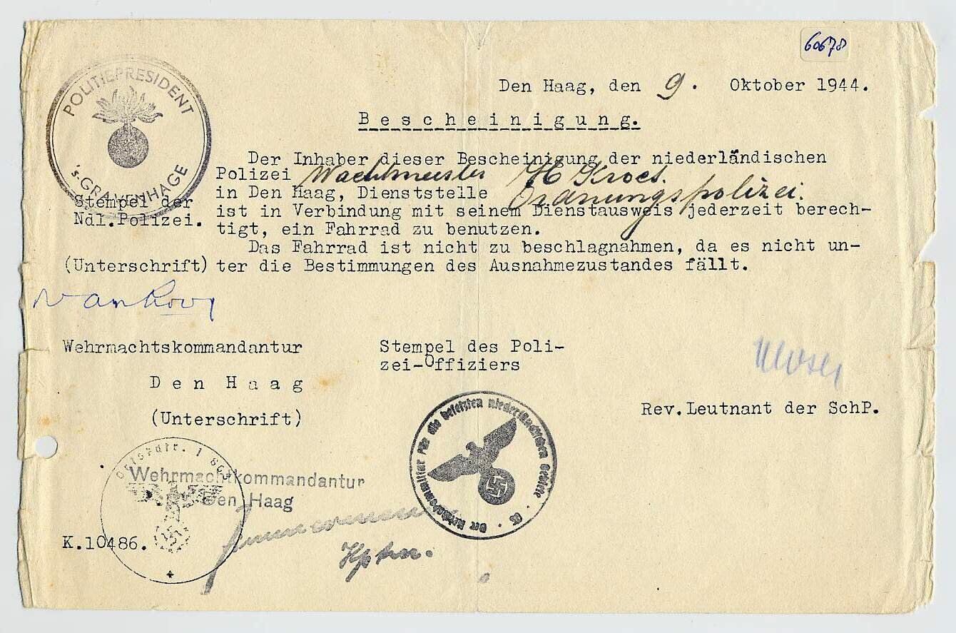 Duitstalige rijwielvergunning waarin wordt verklaard dat H.