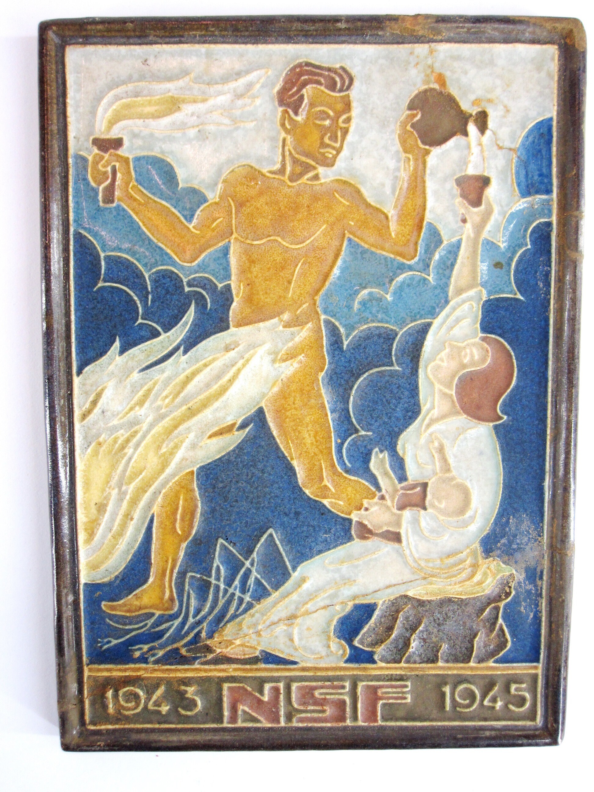 Een geglazuurde rechthoekige aardewerken siertegel ter herdenking aan het verzet door de organisatie "Nationaal Steunfonds" in de jaren 1943 - 1945". Afgebeeld tegen een achtergrond van wolken zijn een zittende vrouw met baby in de armen die van en langsrennende naakte man uit een bolle kruik te drinken krijgt. In de andere hand houdt de man een fakkel vast. Een grote vlam bedekt een deel van zijn onderlichaam. Onderaan staat: "1943 NSF 1945". Het geheel is gevat in een bruine rand. Op de ongeglazuurde witgrijze achterkant is het logo van de "Porceleyne Fles" te Delft aangebracht en onderaan de tekst: "Ontwerp Nationaal Steunfonds Jan Rot". Bovenaan zijn twee gaatjes aangebracht om de tegel aan een wand te kunnen bevestigen.