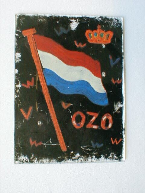 Een zwart gemaakte glasplaat met daarop een afbeelding in kleur van de Nederlandse vlag. Rechtsboven een oranje kroontje en rechtsonder de letters OZO (= Oranje Zal Overwinnen). Verspreid zijn de leters'v' en 'w' aangebracht. De zwarte achtergrond is aan de achterzijde opgebracht en is vooral aan de randen van het plaatje afgesleten.