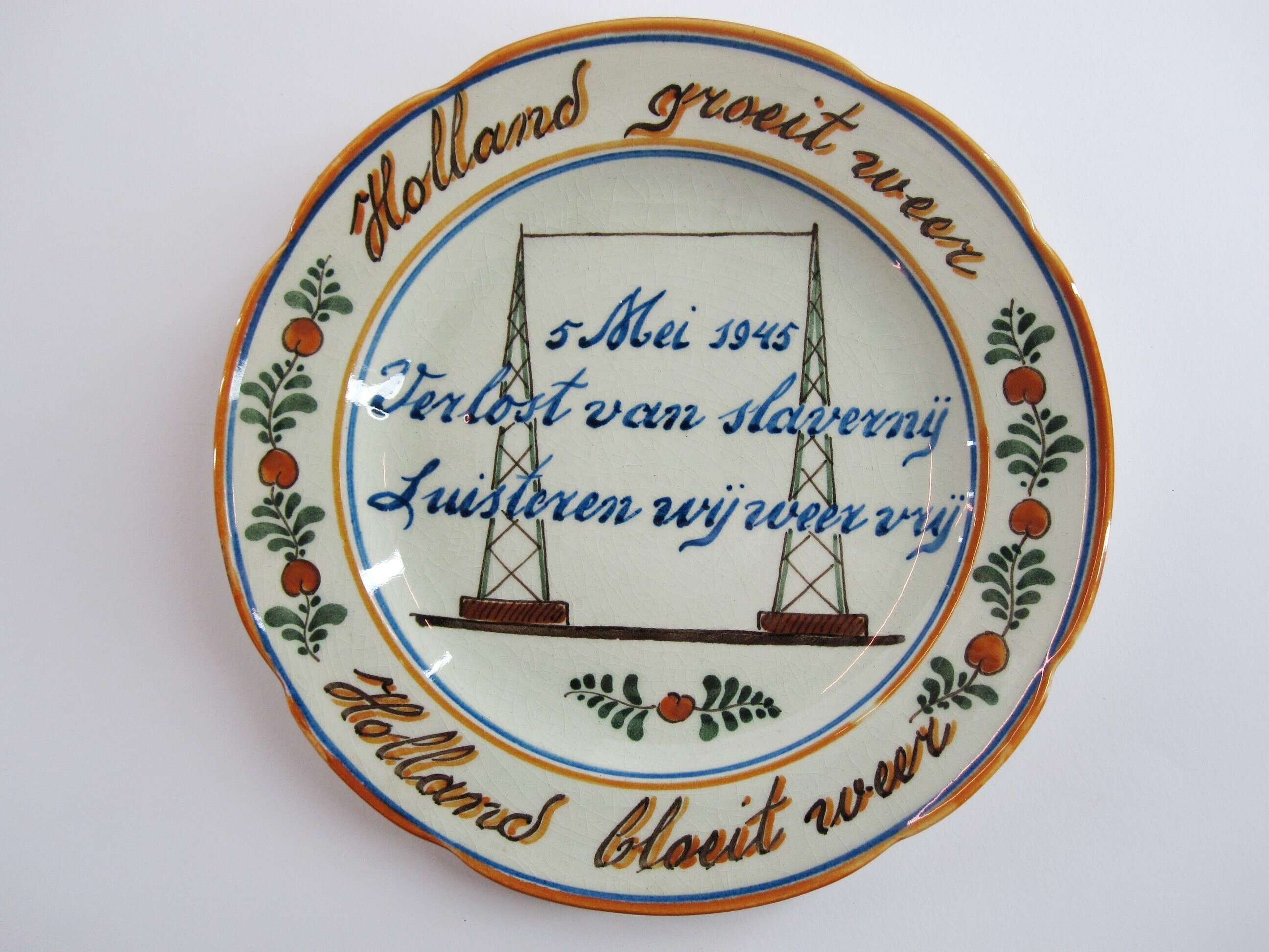 Een gedenkbord met op de geschulpte rand bovenaan: "Holland groeit weer" en onderaan: "Holland bloeit weer". Hiertussen een versiering met 'appeltjes van Oranje'. In het midden de afbeelding van twee met elkaar verbonden zendmasten met daarover heen de tekst: "5 mei 1945 Verlost van slavernij luisteren wij weer vrij". Hieronder weer een 'appeltje van Oranje'. Op de onderkant het logo van de "N.V. Koninklijke Plateelbakkerij Zuid-Holland Gouda" met de tekst: "Gouda Holland 5". Hierboven zijn twee gaten aangebracht waardoor een elektriciteitsdraad is gestoken voor het ophangen aan een wand.