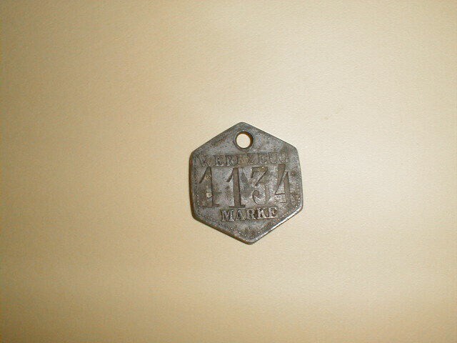 Zeshoekig zinken plaatje met aan de ene zijde de tekst "Werkzeug 1134 Marke" en aan de andere zijde de letters "MS". Aan de bovenkant een gaatje.