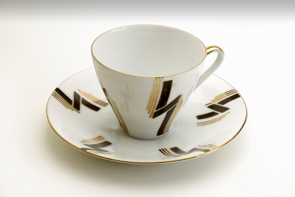 Een kop en schotel van wit porselein met gouden randen en zowel op het kopje als op het schoteltje in het zwart het gestileerde runenteken 'S', het symbool van de SS, geaccentueerd door gouden streepjes. Op de onderkant het merkteken van de firma Winterling.