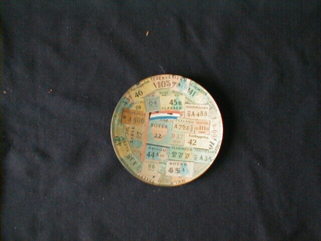 Ondiep rond glazen schaaltje dat aan de achterzijde volledig beplakt is met voedselbonnen en de afbeelding van de Nederlandse driekleur. Het schaaltje is gemaakt uit het glas van een horloge.