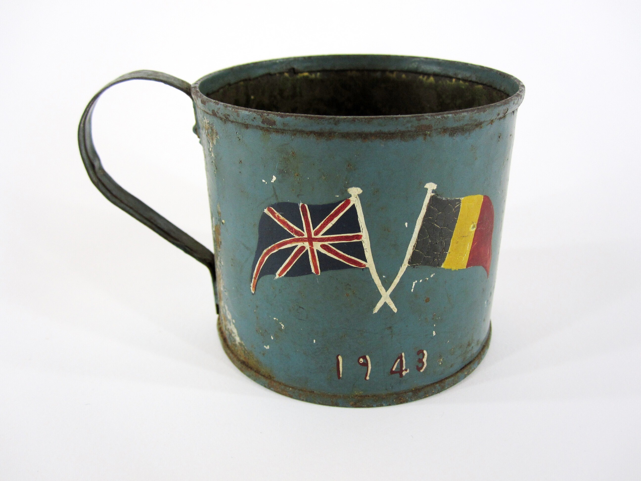 Een blauwgroen geverfde kroes gemaakt van een conservenblik met aangelast oor. Op het blik zijn de Engelse en de Belgische vlag geschilderd zodanig dat de vlaggenstokken elkaar van onderen kruisen. Hieronder staat het jaartal 1943. Op de bodem de tekst: 'For export only'.