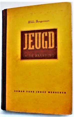 Een gebonden boek met een gele kaft en een bruine linnen rug. Op de kaft in een bruin vierkant de titel in gouden letters: "Jeugd in de Branding". Bovenaan de auteur: "Hilda Bongertman" en onderaan: "Roman voor jonge menschen". Het boek telt 158 bladzijden.