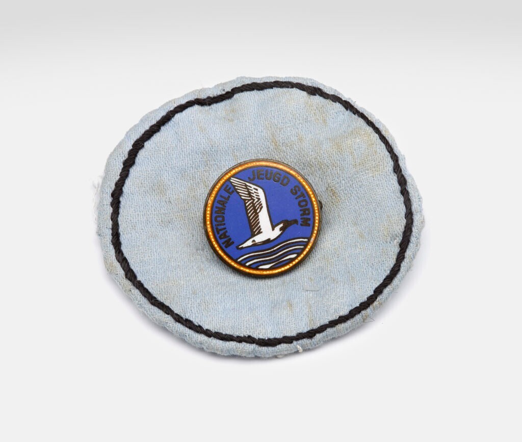 Zelfgemaakt rond embleem, vervaardigd van een lichtblauwe stof, aan de rand afgezet met een zwart geborduurde cirkel. Midden op het embleem zit een bronzen speldje van de Nationale Jeugdstorm daarop in email een witte boven water vliegende vogel in een blauw veld omgeven door een oranje bies. Het speldje heeft een veiligheidssluiting.