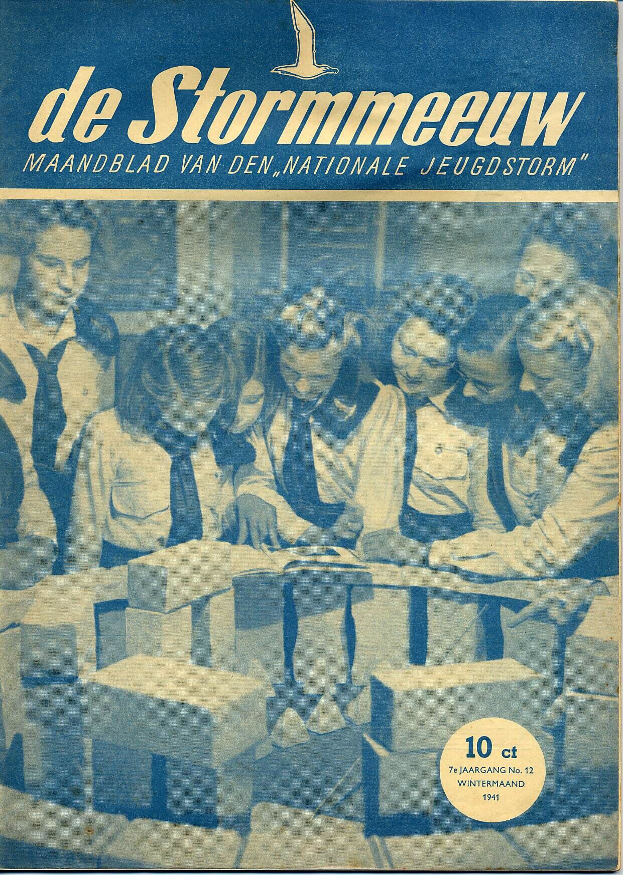 Een exemplaar van het tijdschrift van de Nationale Jeugdstorm. Op de in blauw gedrukte omslag een foto van 'Stormsters' bij een bouwwerk van blokken dat Stonehenge moet voorstellen.