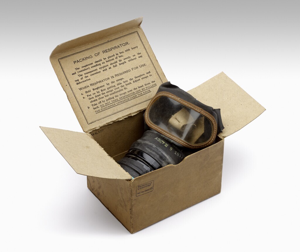 Zwart rubberen gasmasker voor kinderen van engels fabricaat (typenummer: WWM 0304). Het is voorzien van witte katoenen hoofdbanden die met metalen gespjes aan het masker vastzitten. Aan het masker een groene metalen filter dat met zwarte tape aan de rest van de filterbus zit. Het masker is opgeborgen in een bruine kartonnen doos met op de binnenkant van het deksel in het Engels de gebruiksaanwijzing.
