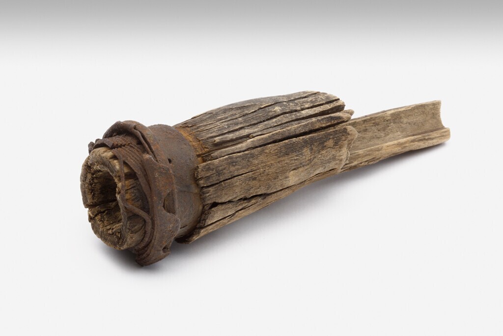 Een gedeelte van het houten handvat met ijzeren ring van een Duitse handgranaat.