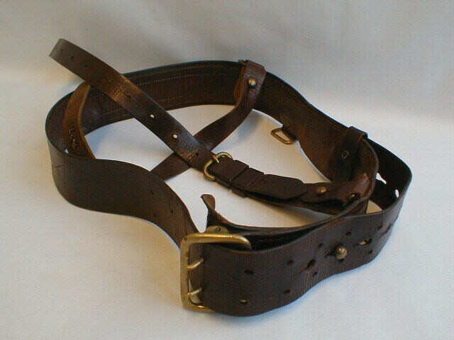 Een militaire draagriem bestaande uit twee riemen. Een voor om het middel met daaraan vast een riem voor over de linkerschouder. Aan de riem een gesp en ophangbeugels van messing.