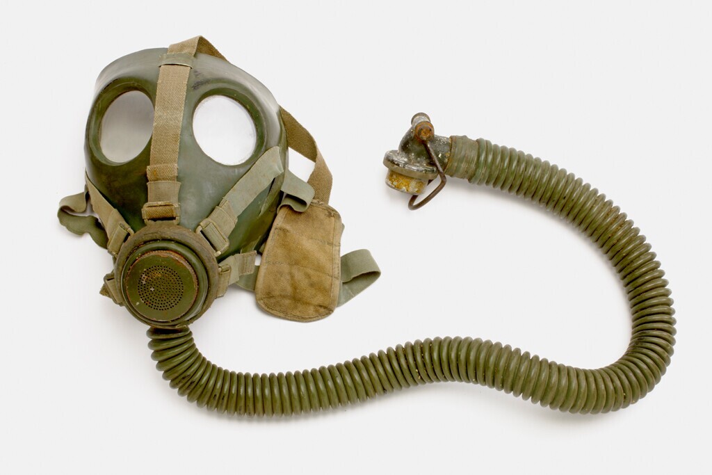 Groen rubberen gasmasker voorzien van katoenen banden die met metalen gespen aan een ring verbonden zijn. Deze ring past om een filter bij de neus. Het masker is voorzien van een rubberen slang die aan een gasfilterbus aangesloten kan worden. Nederlands gasmasker F1926.