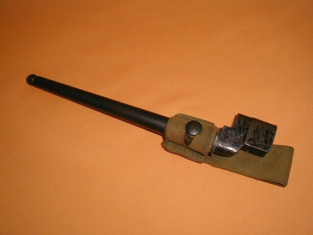 Een Engelse bajonet, compleet met schede en draaghouder. Het gaat om een spijkermodel voor een Lee Enfield geweer.
