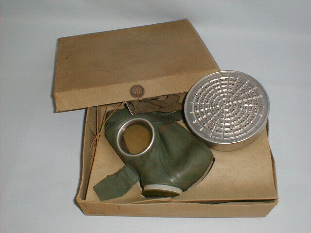 Groen rubberen gasmasker voorzien van gedeeltelijk katoenen hoofdbanden. Bij het masker hoort een metalen gasfilterbus. Op het masker staan enkele rode stempels waarvan een met het Hakenkruis en een nummer:136. Het masker en de bus zijn opgeborgen in de oorspronkelijke opbergdoos waarop o.a. de letters: V.M.M. Deze uitrusting behoorde aan een schipper die op Duitsland voer. Gasmaskers waren in Duitsland verplicht.