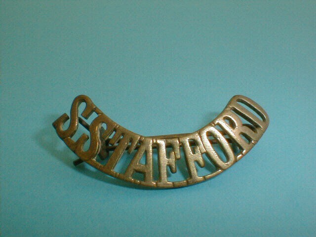 Een messing badge met daarin uitgesneden: "S. Stafford" van het South Staffordshire Regiment dat ingezet werd in september 1944 bij de Slag om Arnhem in het kader van de Operatie Market Garden.