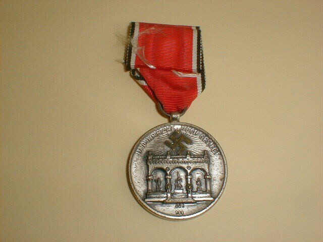 Een zilverkleurige metalen replica van de Blutorden medaille. Aan de voorzijde de afbeelding van de 'Feldherrnhalle' in München met daarboven een Hakenkruis omgeven door stralen en de tekst: 'Und Ihr habt doch gesiegt'. Hieronder: 869 900. De 900 staat voor het gehalte zilver en 869 voor het nummer van afgifte: in totaal zijn er niet meer dan 6000 genummerde medailles afgegeven. Aan de keerzijde een adelaar met een krans in de klauwen en de tekst: 'München 1923-1933'. De medaille is voorzien van een rood lint met dunne zwart-witte randen. De medaille werd uitgegeven ter herinnering aan de mislukte Bierkellerputsch van 1923 door de NSDAP in München.