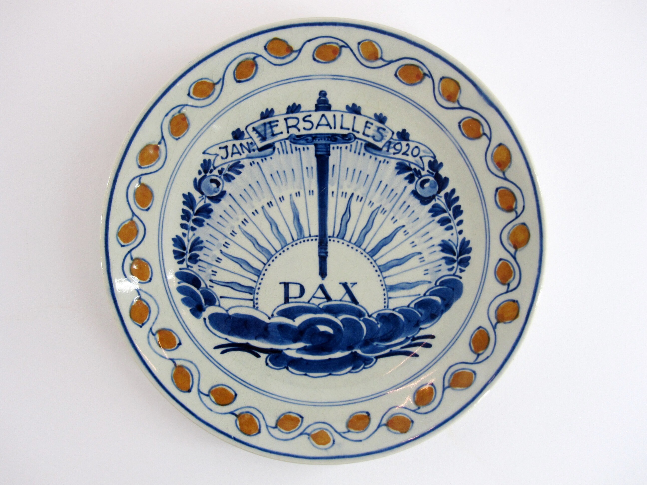 Een gedenkbord van Delfts aardewerk met op de rand een versiering met 'appeltjes van oranje'. In het midden de voorstelling van een achter een donkere wolkenpartij opkomende stralende zon. Op de zon staat: "Pax". Bovenaan een naar beneden gericht zwaard met over de handgreep: "Jan. Versailles 1920". Achter de handgreep een naar beneden aflopende lauwerkrans die tot aan beide uiteinden van de wolken loopt.<br>Op de onderkant van het bord staat het logo van "De Porceleyne Fles" en de plaatsnaam: "Delft" en: "R. 146". Het getal '10' is in het bord gedrukt. Hier zijn ook twee gaten aangebracht waar een metalen draad doorheen is gehaald met een oog om het bord aan een wand op te hangen. Het Verdrag van Versailles (Vredesverdrag van Versailles of Vrede van Versailles) werd op 28 juni 1919 getekend en trad op 10 januari 1920 in werking. Hiermee was de Eerste Wereldoorlog officieel beëindigd.