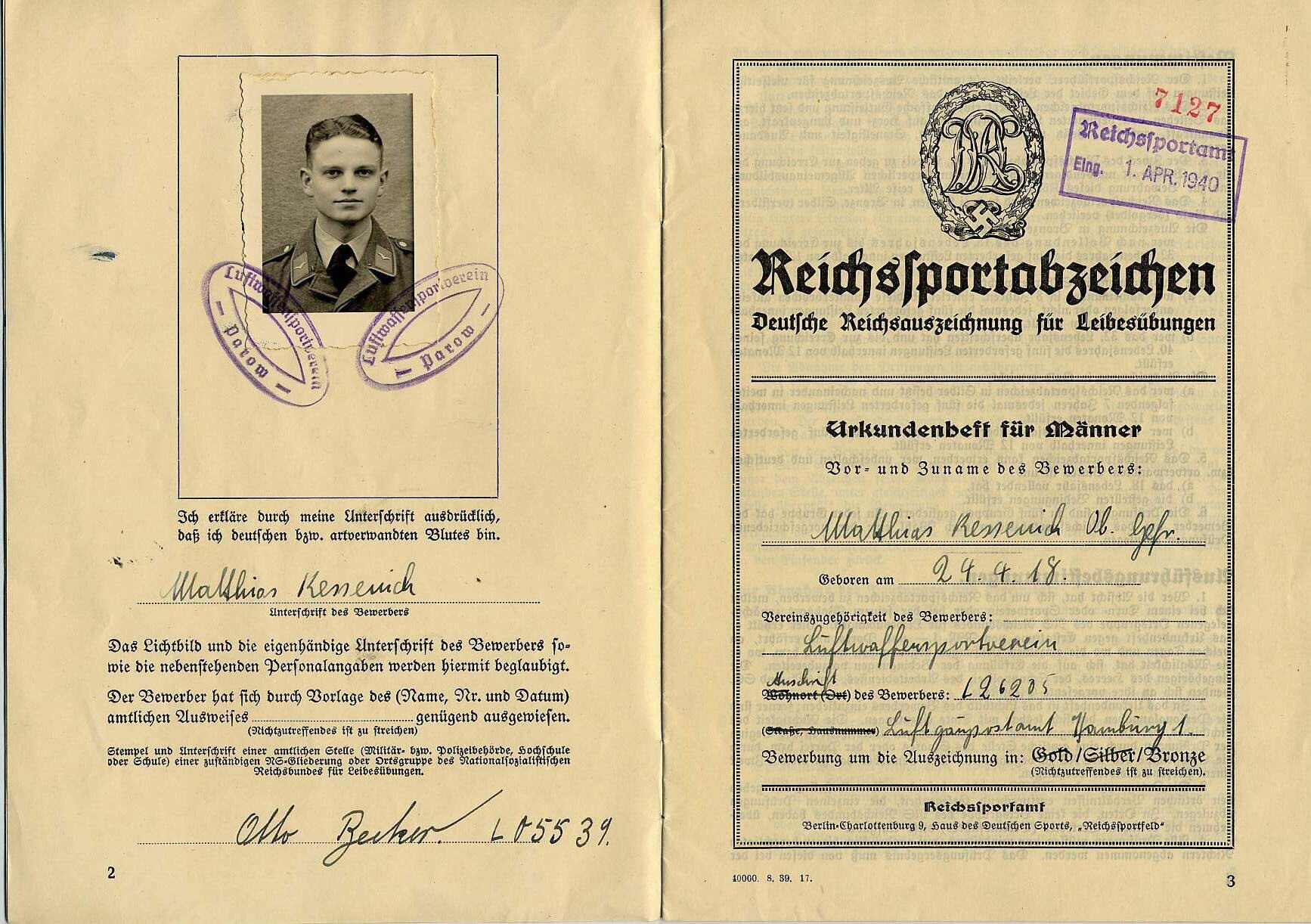 Een oorkonde op naam van Matthias Kessenich voor het "Reichssportabzeichen" van de "Luftwaffensportverein" met bijbehorende onderscheiding in de vorm van een bronzen ovale speld.