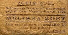 Bruin papieren zakje met zoetmiddel: "Melissa Zoet''. De inhoud is nog aanwezig. Volgens opschrift heeft de inhoud een zoetkracht gelijk aan 50 gram suiker.