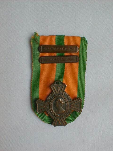 Een bronzen medaille in de vorm van een kruis met op de vier armen: "W" en tussen de armen een krans van eikenbladeren. In het midden van het kruis in een ovaal medaillon het portret van Koningin Wilhelmina en profil van links gezien. De rand van het ovaal wordt gevormd door een dichtgeknoopte kousenband met: "Voor krijgsverrichtingen". De medaille is bevestigd op een lint met oranje en groene banen. Dit lint is vastgezet op een met groene stof overtrokken plaatje met de firmanaam: "Tack Breda". Op het lint twee gespen. Eén met: "Krijg ter zee 1940-1945" en één met: "Javazee 1941-1942". Het oorlogsherinneringskruis werd op 6 van 16 maart 1944 ingesteld voor allen die in de oorlog tegen de Asmogendheden hadden gediend.