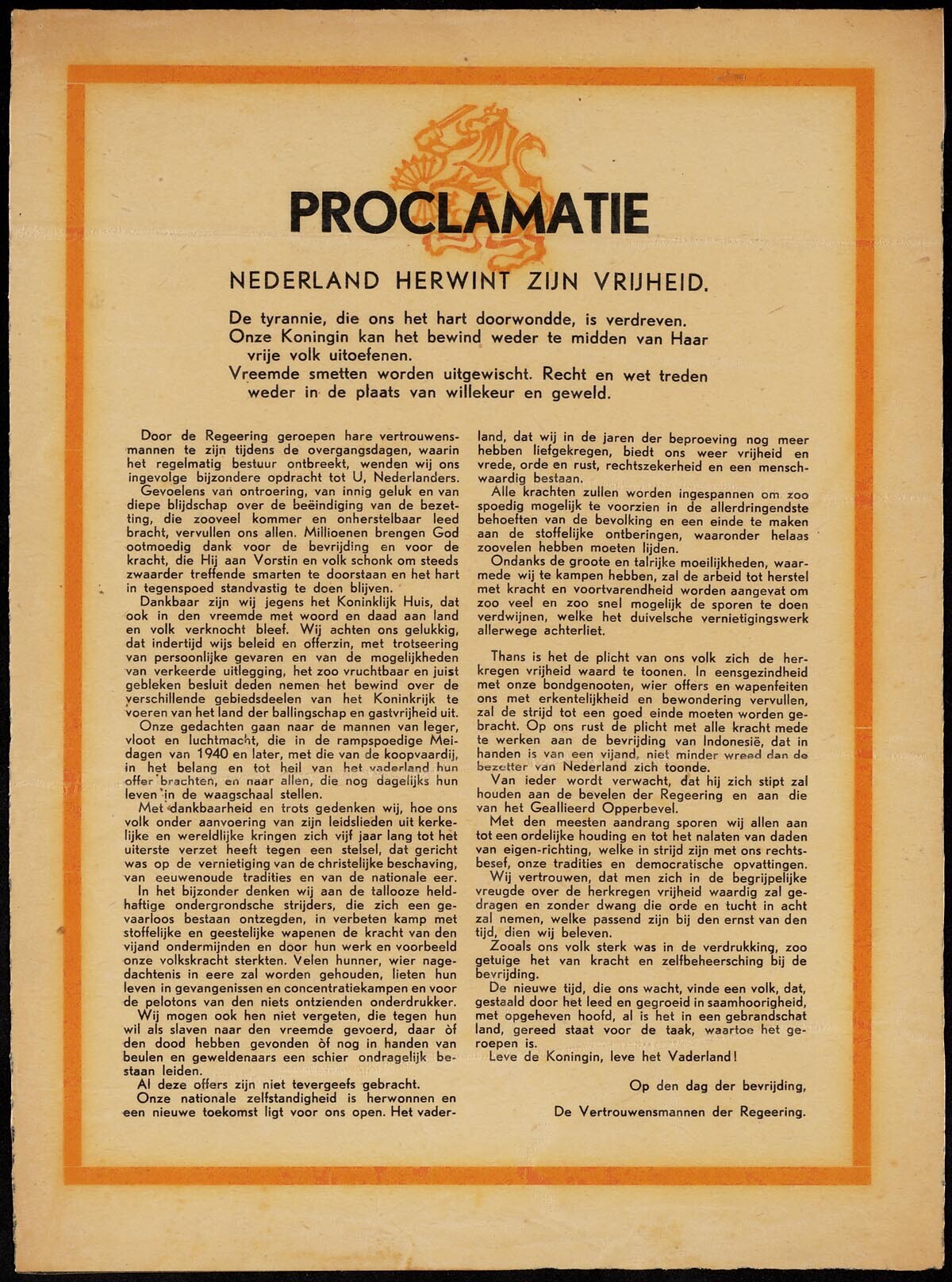 Een affiche met een in een oranje kader gedrukte "Proclamatie. Nederland herwint zijn vrijheid" namens "De Vertrouwensmannen der Regeering". Bovenaan in oranje gedrukt de klimmende Nederlands Leeuw.