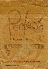 Bruin papieren zakje met een surrogaat voor Perfecta ossenstaartsoep. De de achterkant de gebruiksaanwijzing.