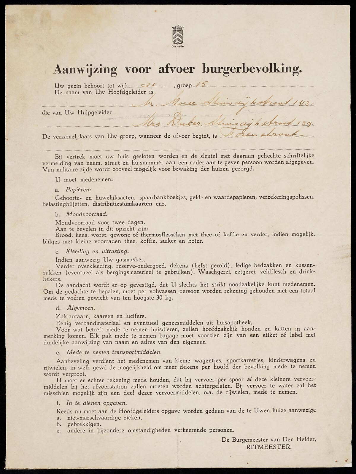 Brief, ondertekend door de burgemeester van Den Helder, met aanwijzingen voor evacuatie: een indicatie van de plaats waar men zich dient te verzamelen en richtlijnen voor mee te nemen goederen, zoals papieren, voedsel, kleding en transportgoederen.