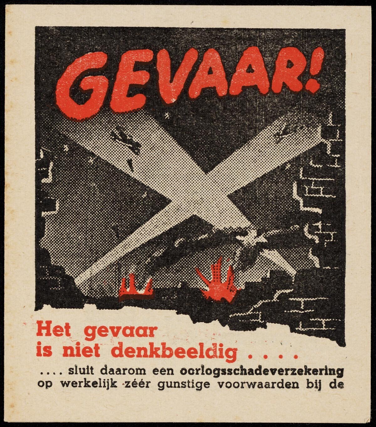 Een zwart en rood gedrukt vouwblad met informatie over verzekering bij oorlogsschade door de 'Onderlinge Nederlandsche Molest verzekering maatschappij'.