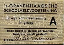 Bewijs van deelneming aan de schoolmelkvoorziening, verstrekt door de Gemeentelijke Jeugddienst voor toelating tot de schoolvoeding. De tekst is gedrukt op een grijs stuk karton waarop een tekening van tekening van melk drinkende kinderen.
