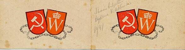 Vijf exemplaren van een pamflet uitgegeven door de N.S.B. tijdens de 'V-actie' met twee wapenschilden verbonden door ketting. Het linker rode wapenschild draagt de afbeelding van hamer en sikkel en het rechter oranje wapenschild een gekroonde 'W'. Op de achterkant de tekst: ''In het teeken van de ''moreele en geestelijke herbewapening'' hebben wij elkaar gevonden''.