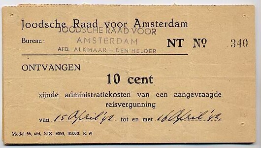 Tien kwitanties, afgegeven door de Joodsche Raad voor Amsterdam, afd. Alkmaar - Den Helder vanwege het ontvangen van het bedrag van 10 cent administratiekosten voor het verstrekken van een reisvergunning. De kwitanties zijn genummerd: 340, 341, 345, 346,360, 365, 369, 377, 379, 384 en zijn alle afgegeven in april of mei 1942.