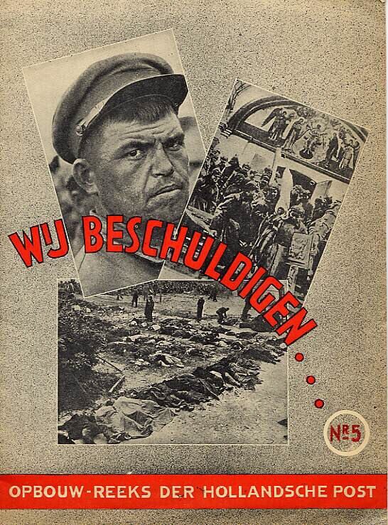 Een boek getiteld: "Wij beschuldigen" met foto's die de gevaren van het Bolsjewisme moeten aantonen. Het gaat om nummer 5 uit de "Opbouwreeks der Hollandsche Post". Los toegevoegd een pamflet met de titel: "Met Duitschland tegen het Bolsjewisme'.