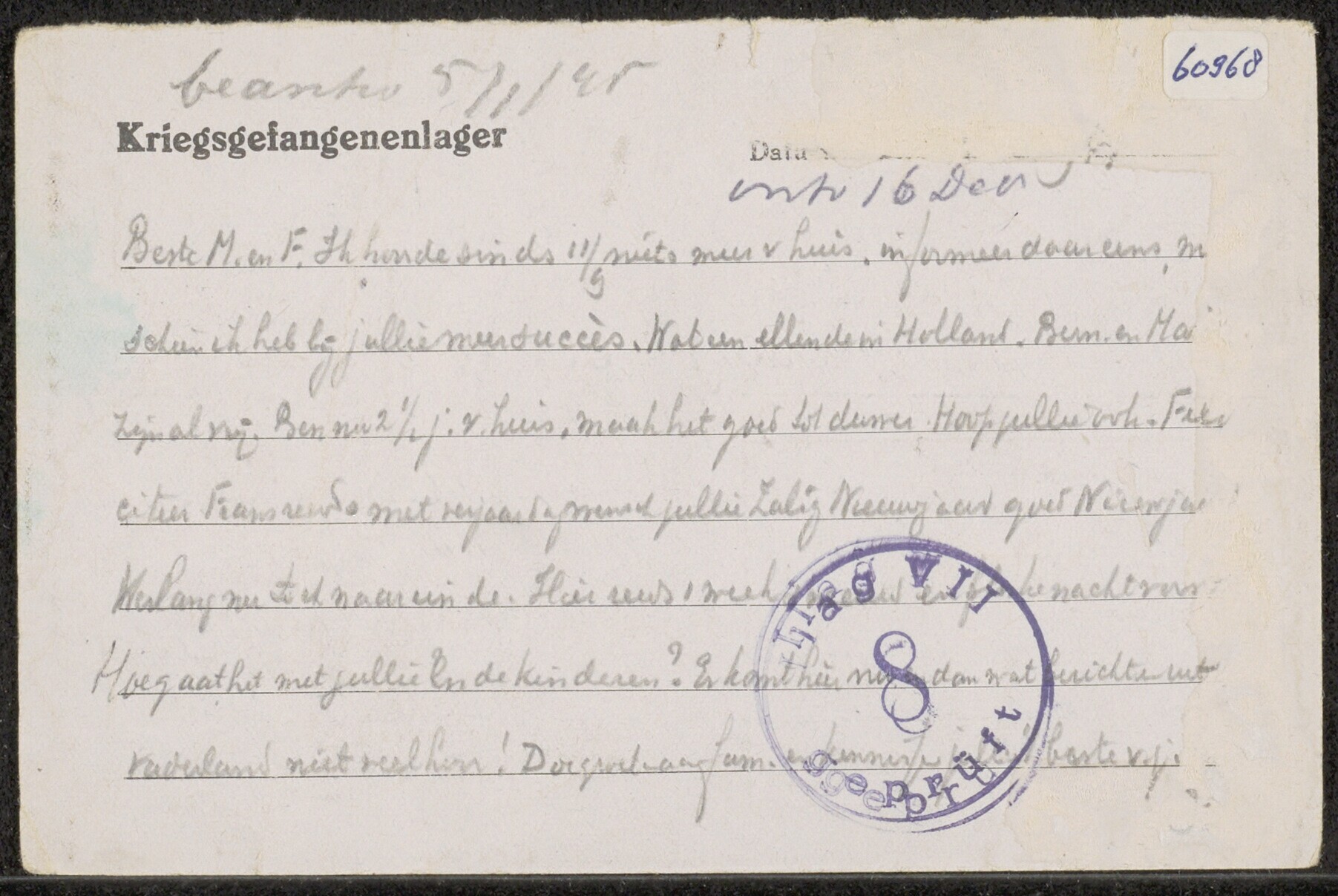 Briefkaart van J.A. Claessen aan F.J. Claessen in Hoorn, gedateerd januari 1945. Onderwerpen: de ellende in Nederland, twee jaar van huis. Op de kaart een stempel: "Ilag VII 8 geprüÂft".