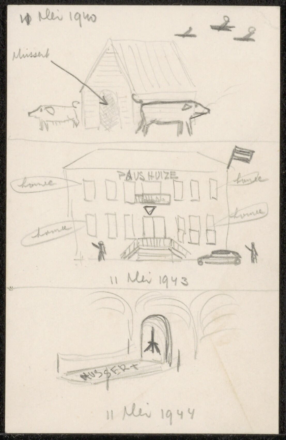 Een potloodtekening met drie afbeeldingen gerelateerd aan Mussert: - 11 mei 1940: een pijl met de naam Mussert wijst naar een varkenshok met twee varkens. Rechtsboven drie vliegtuigen; - 11 mei 1943: een afbeelding van het 'Paus Huize' te Utrecht met de Nederlandse vlag en in vier tekstwolkjes: "Houzee"; - 11 mei 1944: een graf met de naam 'Mussert'.