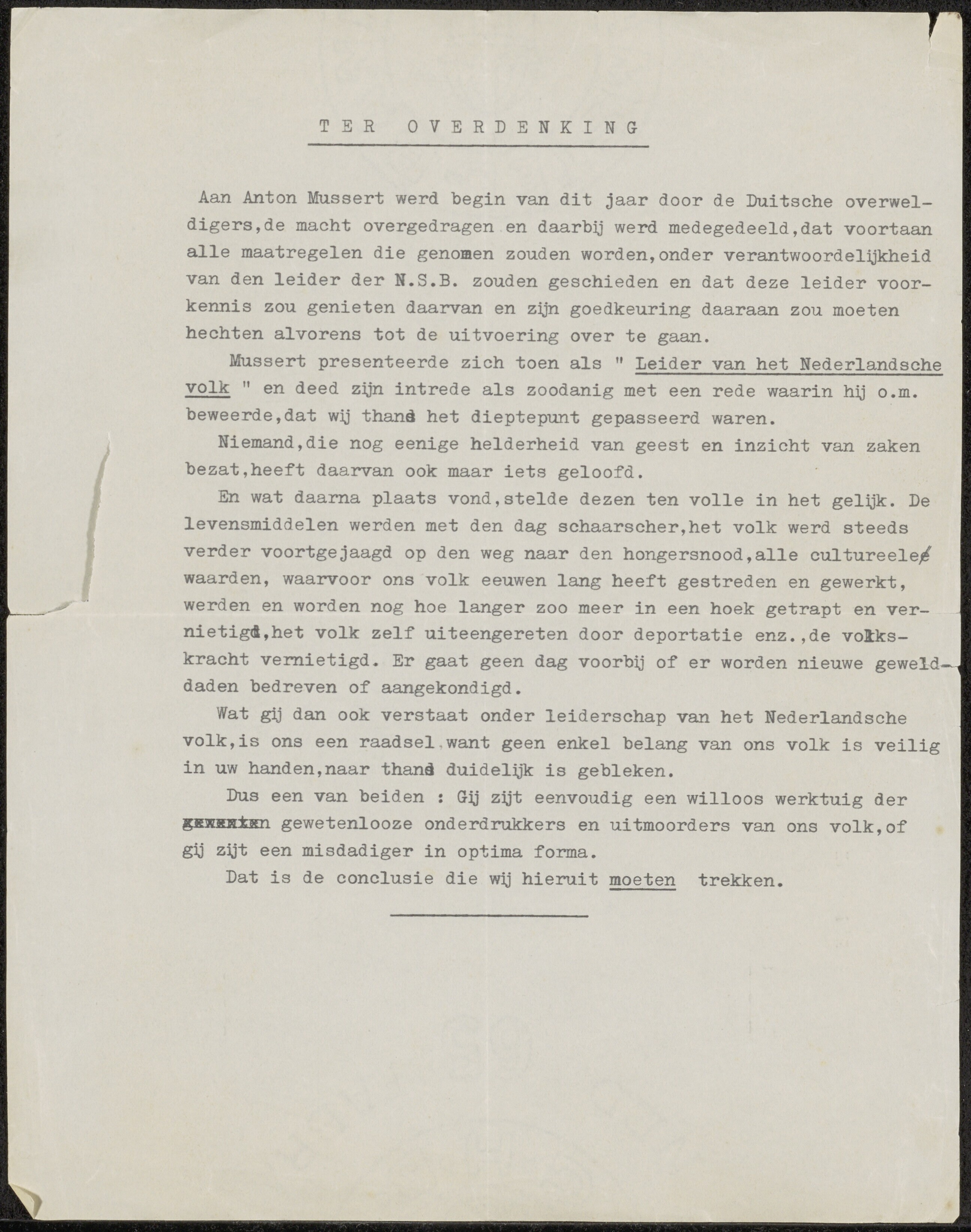 Getypte brief waarin de conclusie wordt getrokken dat Mussert ofwel een willoos werktuig van de gewetenloze onderdrukkers is ofwel een misdadiger in optima forma.