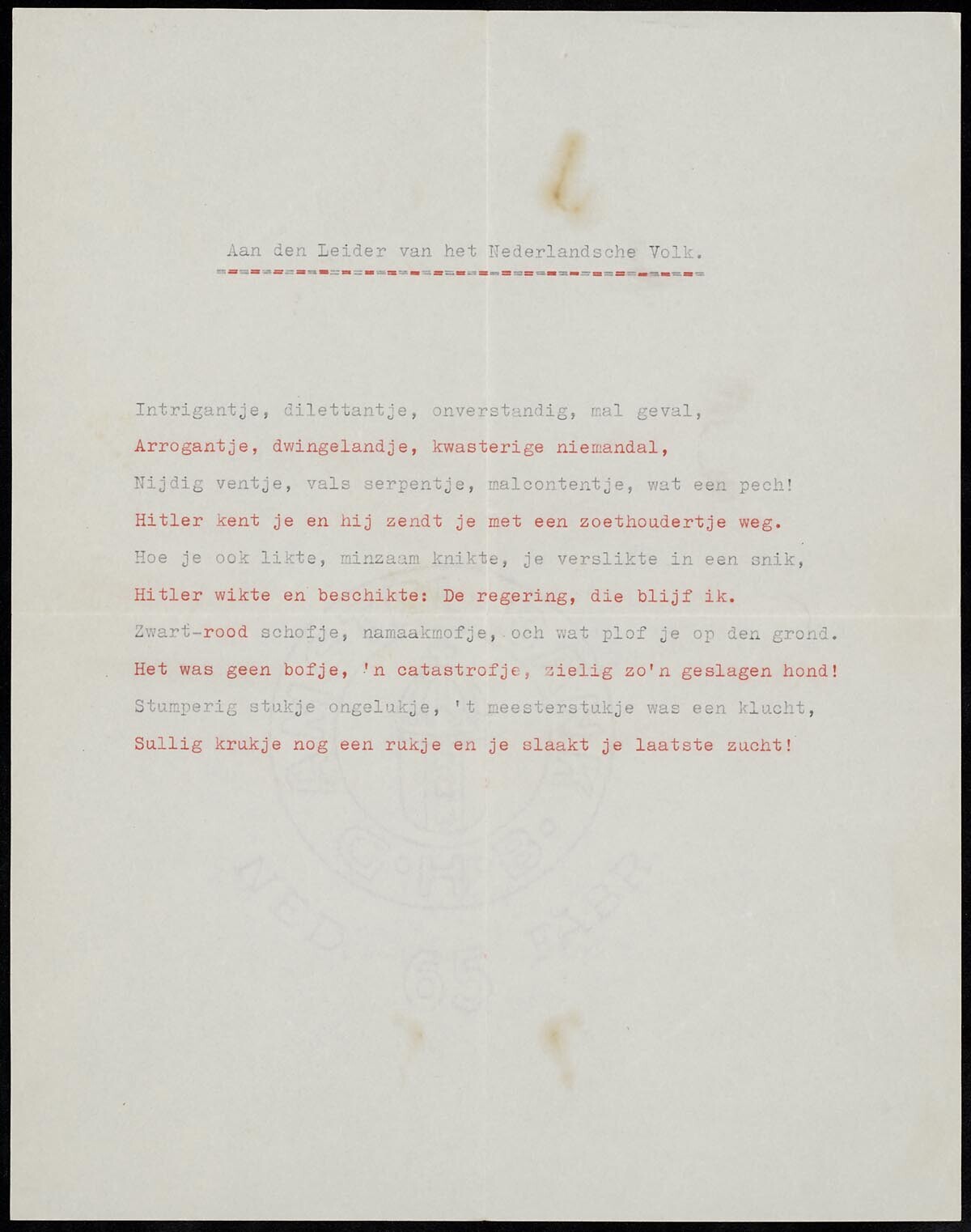 Getypte brief 'Aan den Leider van het Nederlandsche Volk'. In dichtvorm wordt Mussert bekritiseerd en uitgescholden. De zinnen zijn afwisselend in rood en zwart getypt.