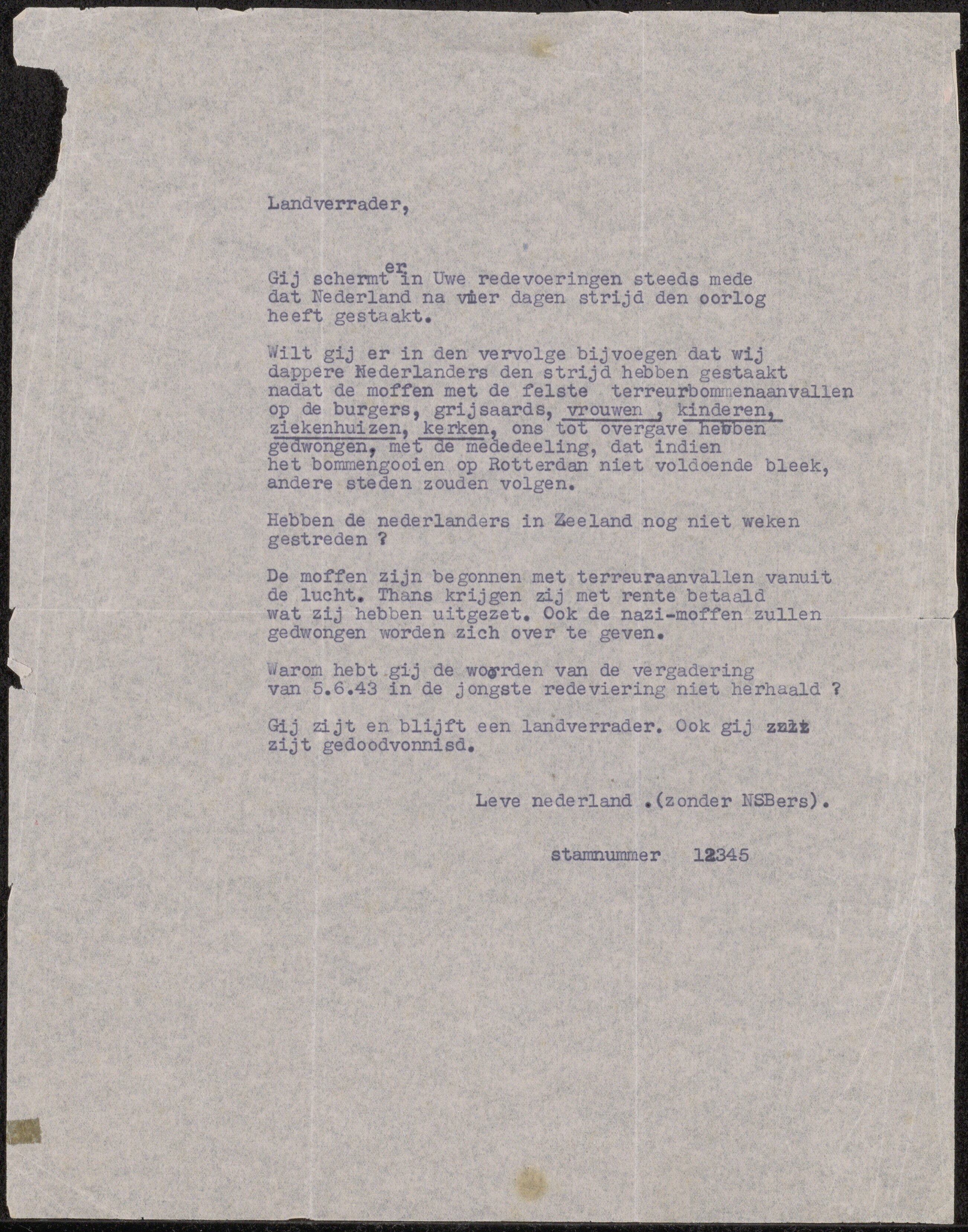 Getypte brief gericht waarin Mussert een landverrader wordt genoemd.