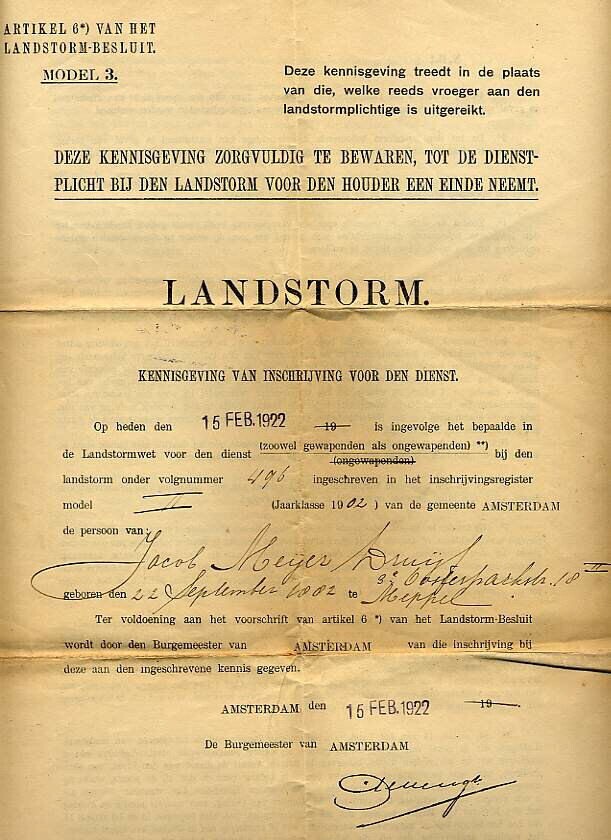 Voorgedrukt en met pen en datumstempel verder ingevuld document van vier pagina's met voorop als tekst: "Landstorm. Kennisgeving van inschrijving voor den dienst. Op heden 15 februari 1922 is ingevolgde het bepaalde in de Landstormwet voor den dienst bij den Landstorm onder volgnummer 496 ingeschreven in het inschrijvingsregister model II van de Gemeente Amsterdam de persoon van Jacob Meijer Druijf (...)." De overige bladzijden bevatten instructies m.b.t. de dienst in de Landstorm.