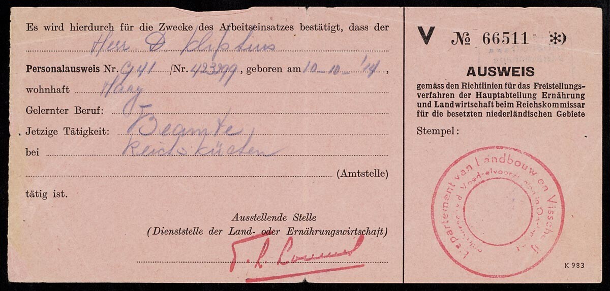 Voorgedrukte en met potlood verder ingevulde Duitstalige roze bon waaruit blijkt dat D. Kliphuis uit Den Haag wegens zijn werk in de "ReichskÂüche" vrijgesteld is van de arbeidsinzet.