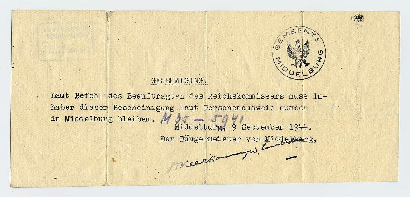 Gestencild, Duitstalig document, waarmee de ontvanger de opdracht krijgt Middelburg niet te verlaten. Met stempel van de Gemeente Middelbug
