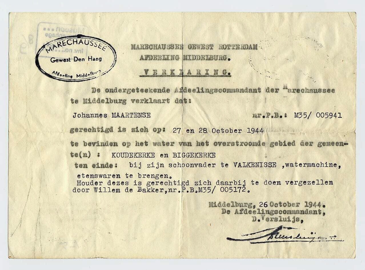 Een vijftal documenten waarmee J. Maartense toestemming krijgt door overstroomd gebied in de provincie Zeeland te reizen, onder meer voor het afleveren van goederen en het opnemen van schade. De vergunningen dateren uit de periode 1944 en 1945.