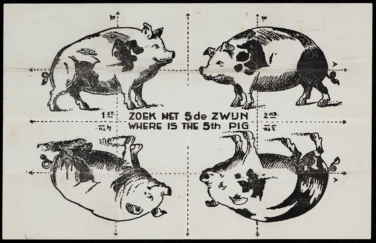 Blaadje met daarop de afbeelding van vier varkens. Door het op de juiste wijze te vouwen, verschijnt het gezicht van Adolf Hitler.