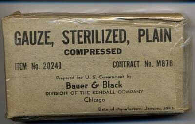 Een pakje Amerikaans noodverband in grijsgroen papier verpakt met daarop in zwarte opdruk: "Gauze, sterilized, plain, compressed; prepared for U.S. Governement".