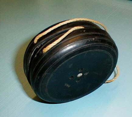 Een ronde zwarte rubberen luchtpomp voor het opblazen van een zwemvest. Het handluchtpompje bestaat uit twee schijven met daartussen een balg. Aan de schijven zijn een touwtjes bevestigd als handvatten. Op beide schijven de letters: P.B.C. Een schijf heeft een rond gat voor lucht toevoer, de andere vier kleinere gaatjes.
