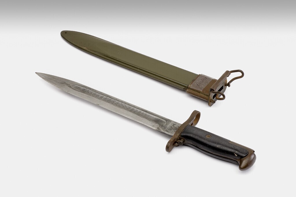 Stalen bajonet in groene metalen schede. Handvat van ijzer en kunststof. Onderaan het handvat een beugel om de bajonet aan op te hangen.