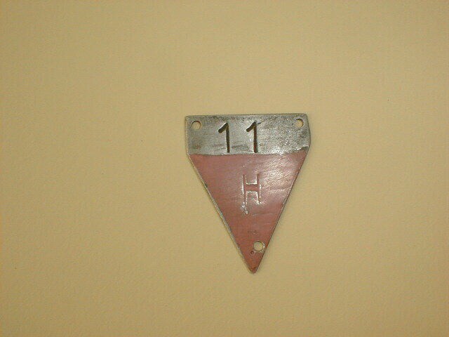 Spits toelopend aluminium plaatje met gaatjes in drie hoekpunten. De driehoek in het spitse gedeelte is roze geschilderd; erin is de letter H zichtbaar. Boven het roze gedeelte het nummer 11. Mogelijk afkomstig uit een concentratiekamp.