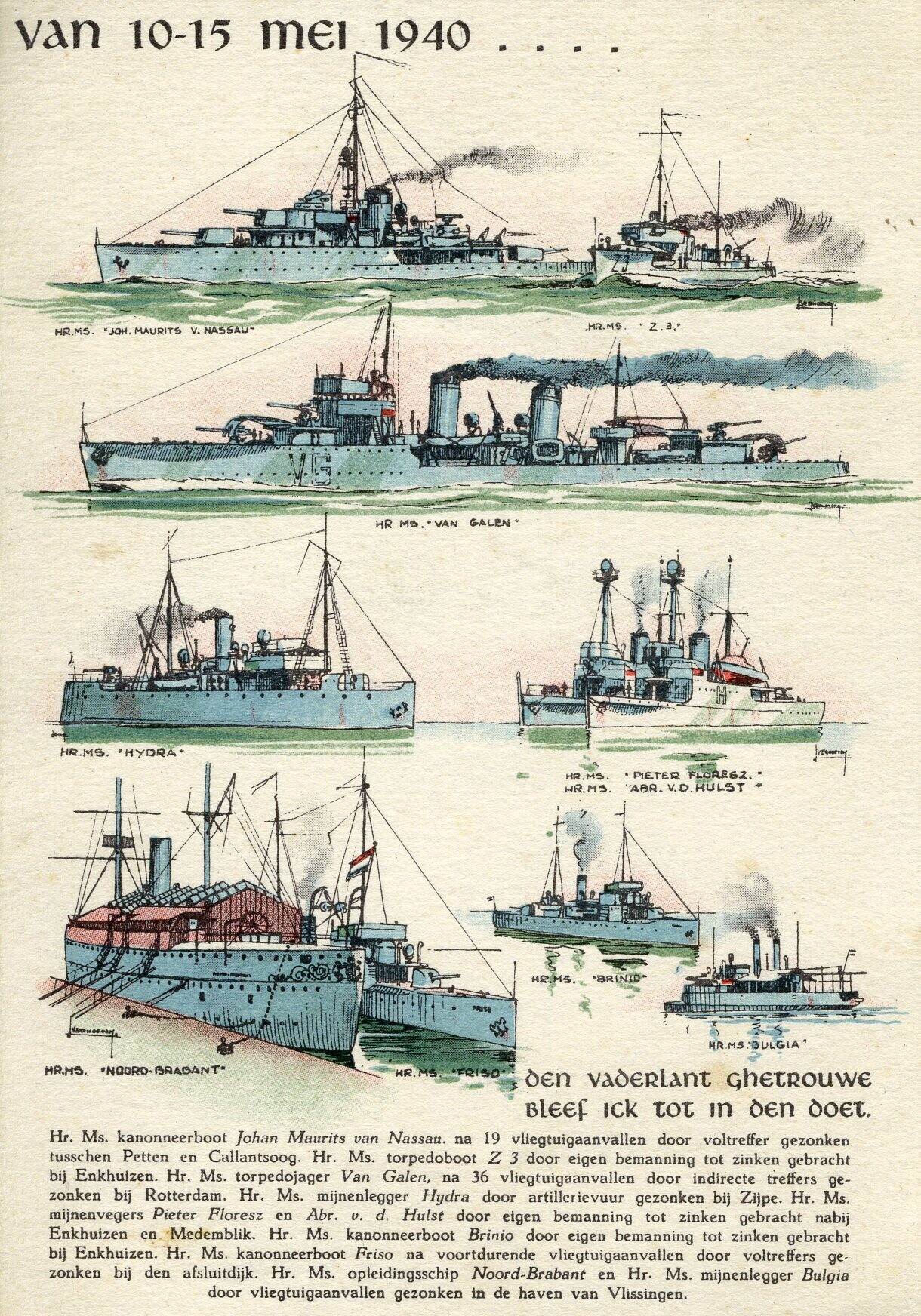 Ansichtkaart met de titel ''Van 10-15 mei 1940....", waarop in kleur getekende Nederlandse oorlogsschepen die aan het begin van de oorlog zijn vernietigd. Van elk schip is beschreven hoe het schip ten onder ging.